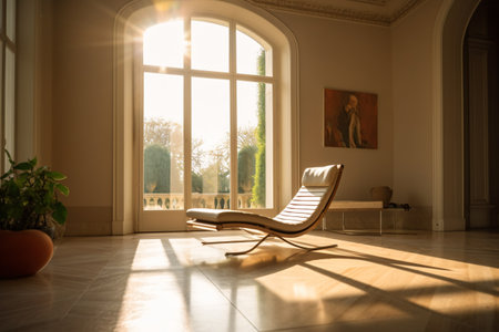A well-lit interior scene featuring a modern armchair, wooden table, and sideboard. The room is bathed in warm sunlight filtering through sheer curtains. The composition emphasizes clean lines and a minimalist aesthetic. This image would be suitable for commercial use in home decor or lifestyle publications.