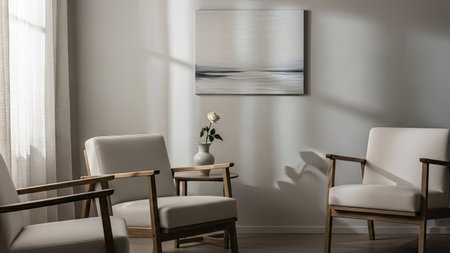 This interior showcases a living room arrangement featuring armchairs and an artwork display. The scene is bathed in natural light, with shadows creating depth. The color palette emphasizes neutral tones, and the composition focuses on the architectural elements. Suitable for illustrating home decor or lifestyle concepts.