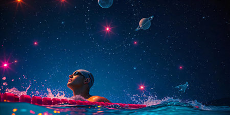 Male swimmer practicing swimming in the pool. Above is a universe with stars and surreal lights surrounding it. AI Generated.