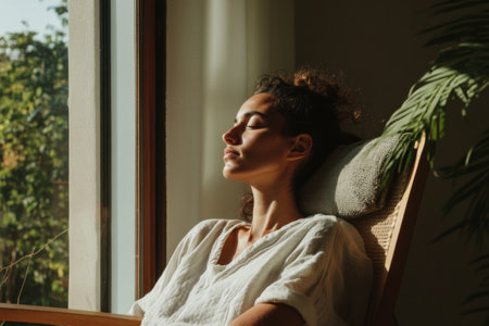Serenity captures a woman enjoying sunlight through a window, reflecting on the beauty of spring while seeking inner peace