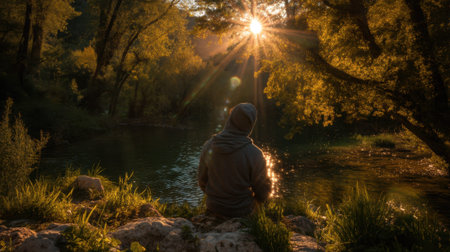 Serene Sunset Reflection Man Relaxing by Lakeside in Tranquil Nature Setting.