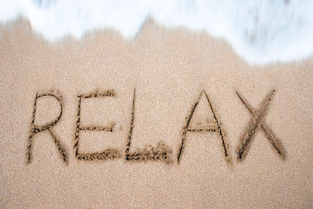 Beautiful tropical leaf, flowers, seashells with the inscription relax, sand, background