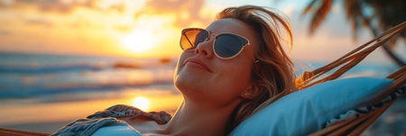 Caucasian woman lying in a hammock at sunset on a tropical beach.