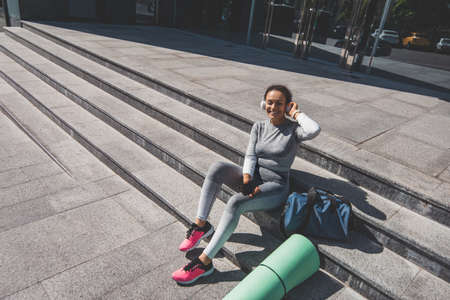Close up of an attractive african fitness woman listening to music with wireless earphones while laying on a fitness mat at the playground