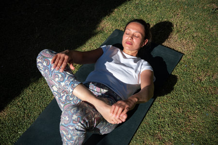 Beautiful middle aged woman lying in corpse pose while meditating outdoors