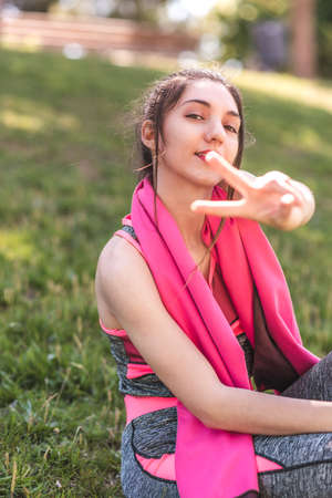 sportswoman sitting on the grass and showing fingers with symbol of success