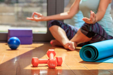 Woman meditating in a yoga pose. Exercise mat and dumbbells on wooden floor