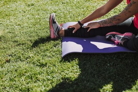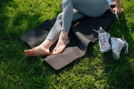 Fit slim woman sitting on mat in the park. healthy lifestyle