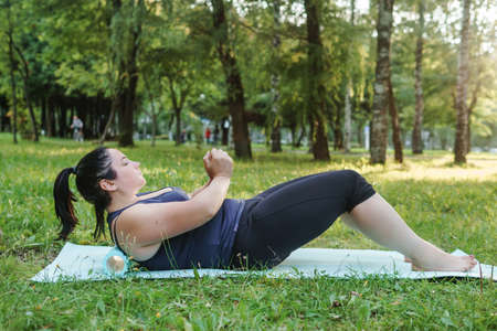 A charming brunette woman plus-size body positive practices sports in nature. Woman is engaged with a massage roller for the body in the park on a sports mat.