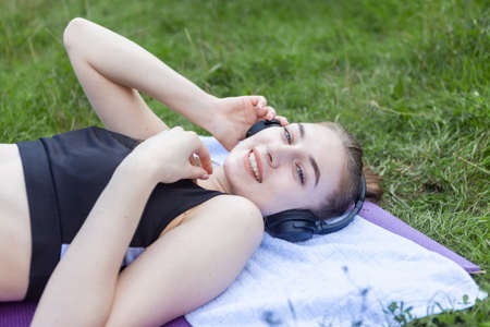 Young cheerful woman in sportswear lies on mat at red-coated stadium track and listens to music on earphones at bright sunny day