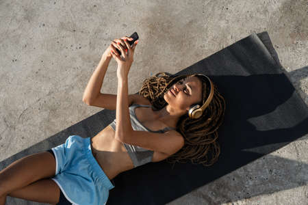authentic african american woman in black sporty bra is lying down on yoga mat floor listening an audio music and looking at camera