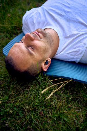 Man laying on sport mat, relaxing in savasana pose after exercising at the fresh air