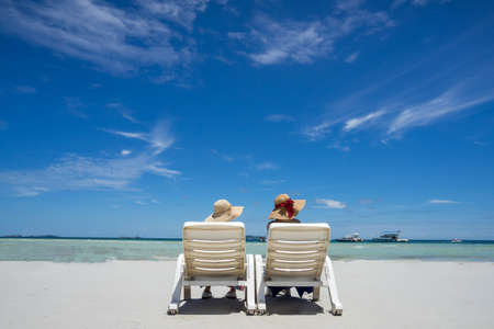 Young woman asian together in hawaii dress sitting with hat on sea beach summer fun and happy relax in vacation time, back view