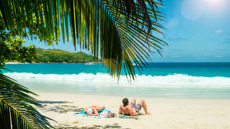 POV shot of man wear blue swimming shorts laying on a beautiful sandy tropical beach Anse Cosos, La Digue, Seychelles