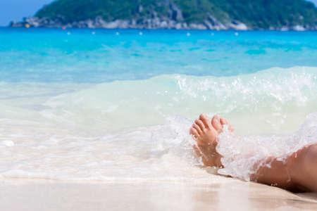 Bare Legs on the beach against the sea on vacation.