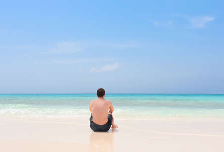 Young man sitting alone on a tropical beach of archipelago Los Roques, Venezuela