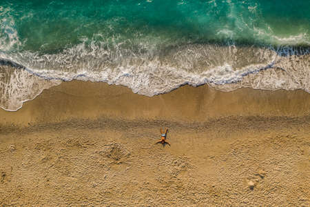 Aerial top down view of man on sandy beach of Milos Beach, Lefkada island, Greece