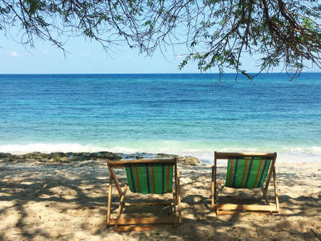 Chair on sand beach under a tree overlooking the ocean,Thailand.