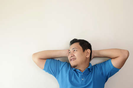 Photo image of young Asian man looked happy, thinking and looking up, hands behind head, having good idea. Half body portrait against grey wall with copy space