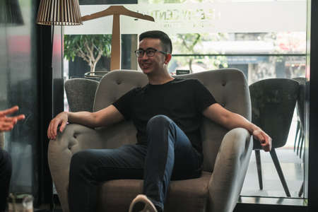 Asian young handsome man sitting in coffee shop, talking and smiling. chinese guy, millennials life, lifestyle in the big city, Modern Asia