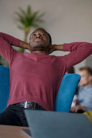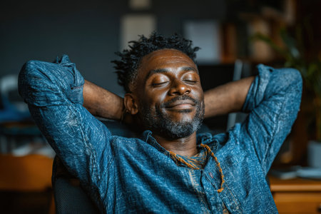 Relaxed African American man is enjoying a peaceful moment in a cozy workspace, with hands behind his head, embodying serenity and comfort in a professional setting