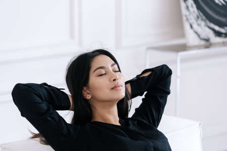 Close up of beautiful young asian woman resting at home, leaning on comfortable white sofa with closed eyes and hands behind head. Tired business lady napping in living room during work break