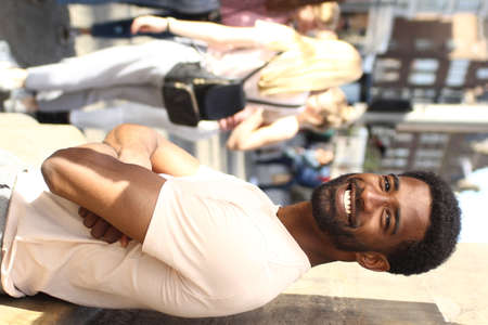African businessman leans back relaxed in front of a gray wall in the office