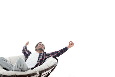 stylish guy stretching in a comfortable chair. photo in the background.