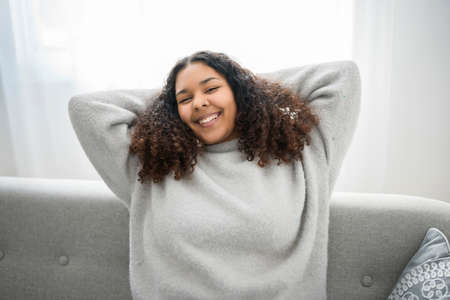 Good vibes. Joyful smiling an sitting on the sofa while having rest