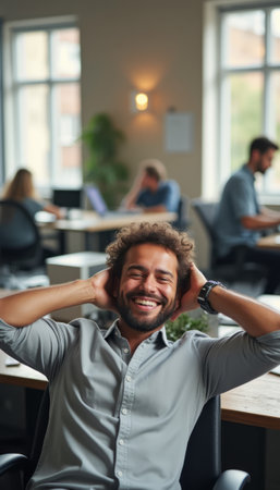 A cheerful man with curly hair sits back in his chair, hands behind his head, radiating happiness in a contemporary office setting. The background features colleagues engaged in work, creating a vibrant atmosphere of collaboration and productivity.