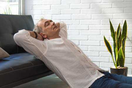 Relaxing man and dreaming on sofa at home with arm behind his head