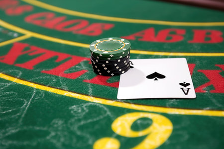 A club ace on a green felt table, with a red poker chip in sight. A perspective from above. The idea of playing poker and taking risks. High quality photo