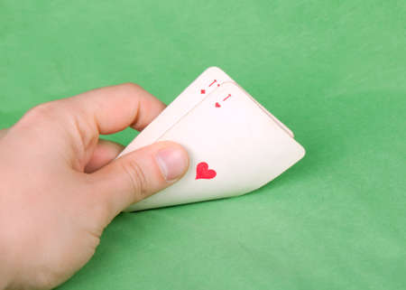 Gambler's hand with two aces on green table