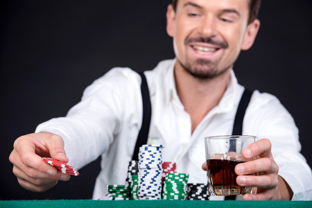 Man is playing poker in casino. Gambling chips and a glass of whiskey on the green table.
