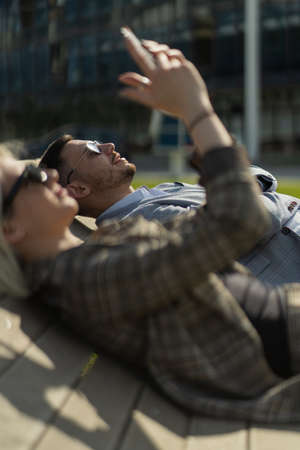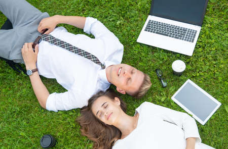 Business people are relaxing while laying on the bench