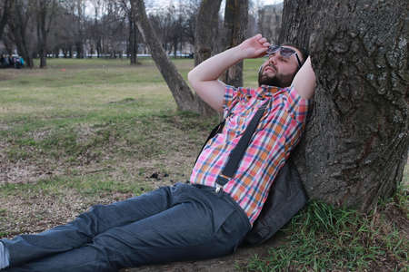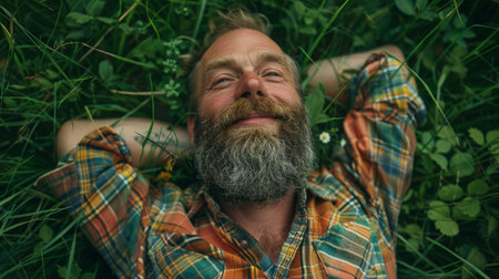 Portrait of a bearded man in a plaid shirt lying on the grass