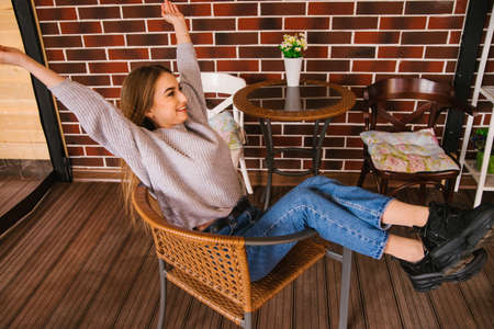 A young woman is sitting on a chair. The girl lifted her feet playfully onto the chair. Joy and a smile on the girl's face.