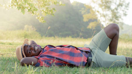 African man relaxing on green grass outdoors in summer with happily on vacation