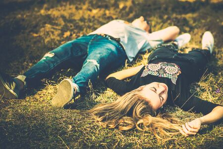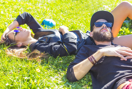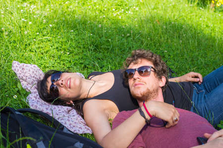 Young adult couple lying down on lush green grass in park, relaxing, embracing. Real people, natural color. Conpept of happy relationship and summer lifestyle.