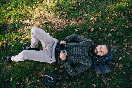 Bearded man lying on green grass in the forest with old film camera
