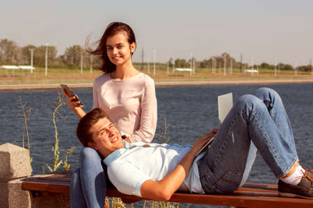 happy young couple using laptop while sitting together in park. Portrait.