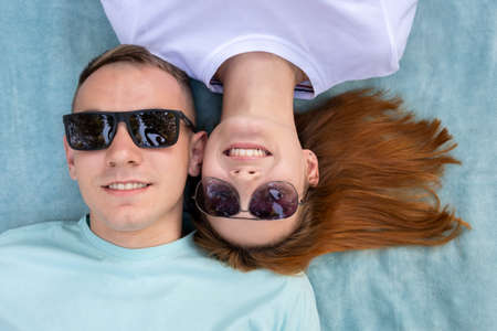 Young teenage couple in sunglasses laying together on blue cloth enjoying love relations.