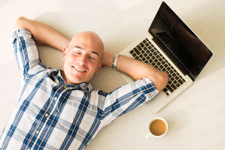 Above view of a businessman resting on the floor with smile after exhausted working day