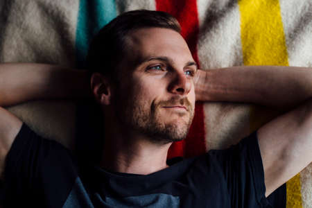 Overhead portrait of handsome man lying on striped blanket with hands behind head