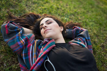Young cheerful woman listening to music with headphones lying on a blanket in park