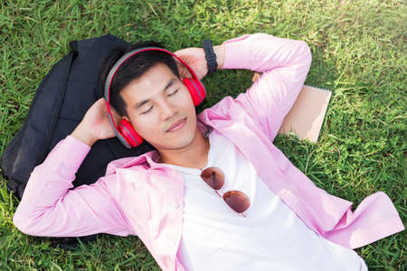 Asian man lie listening to music with headphones on the grass relaxing.