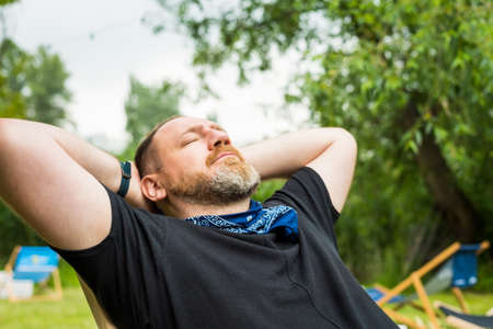adult man relaxes outdoor in a city beach garden holding hands behind head. solo outdoor activities