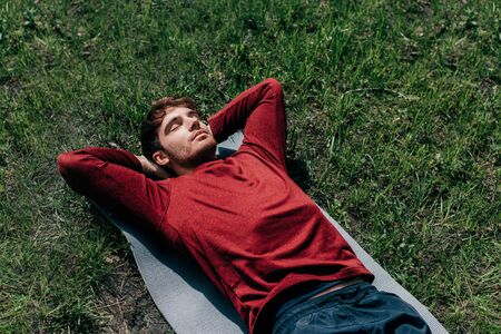 High angle view of handsome sportsman lying on fitness mat in park