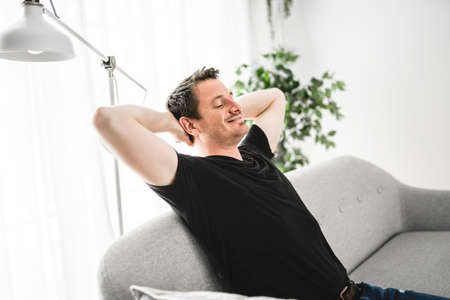 Relaxing man and dreaming on sofa at home with arm behind his head