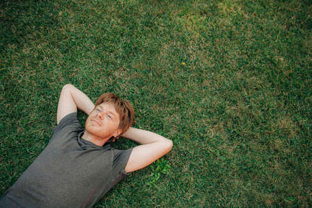 Young happy man is lying and relaxing in grass in park and thinking or dreaming.